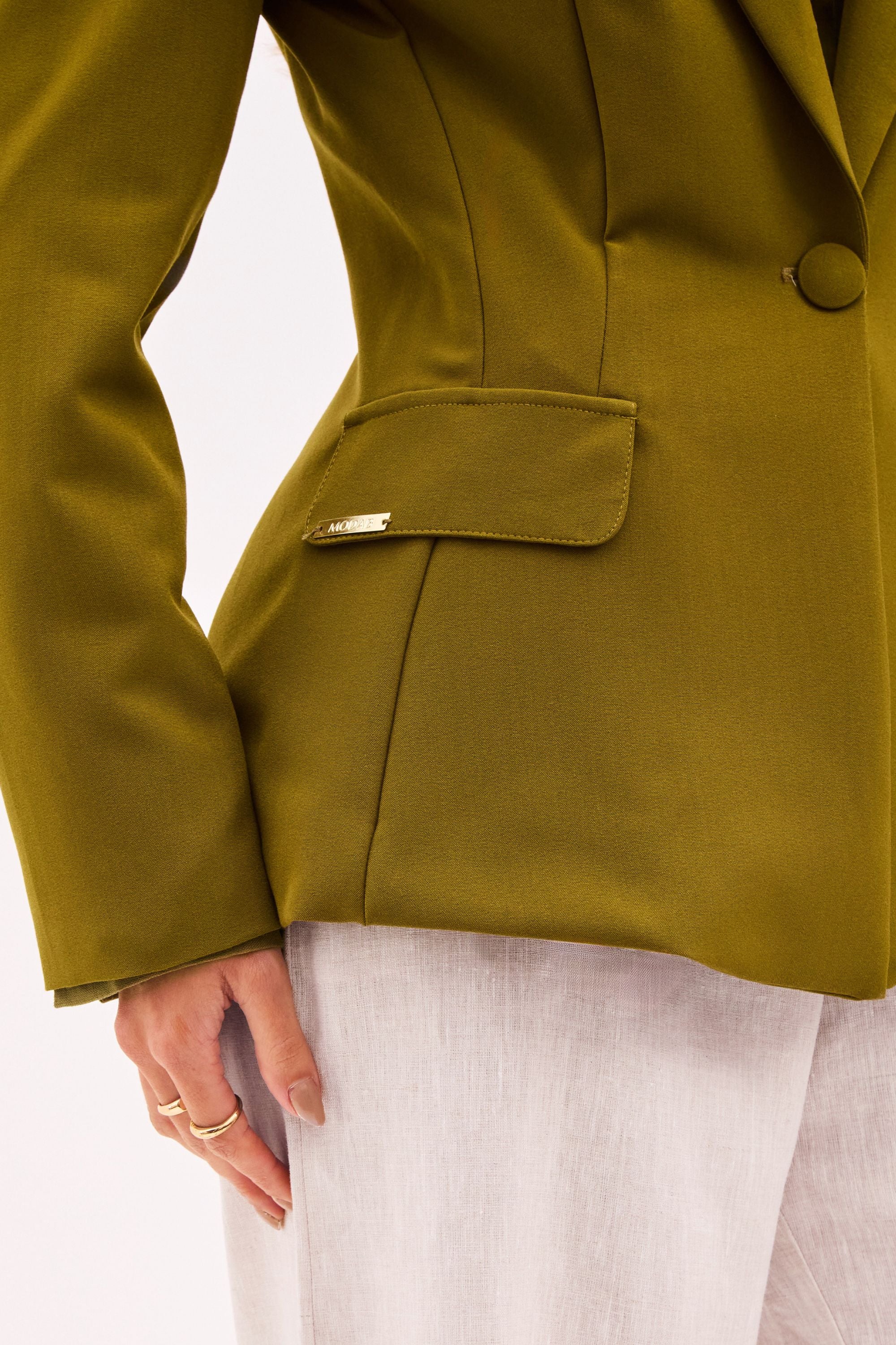 • Acabamento premium, lapelas peaked, fechamento frontal com botão único, ombreiras discretas e bolsos decorativos que elevam o design clássico.