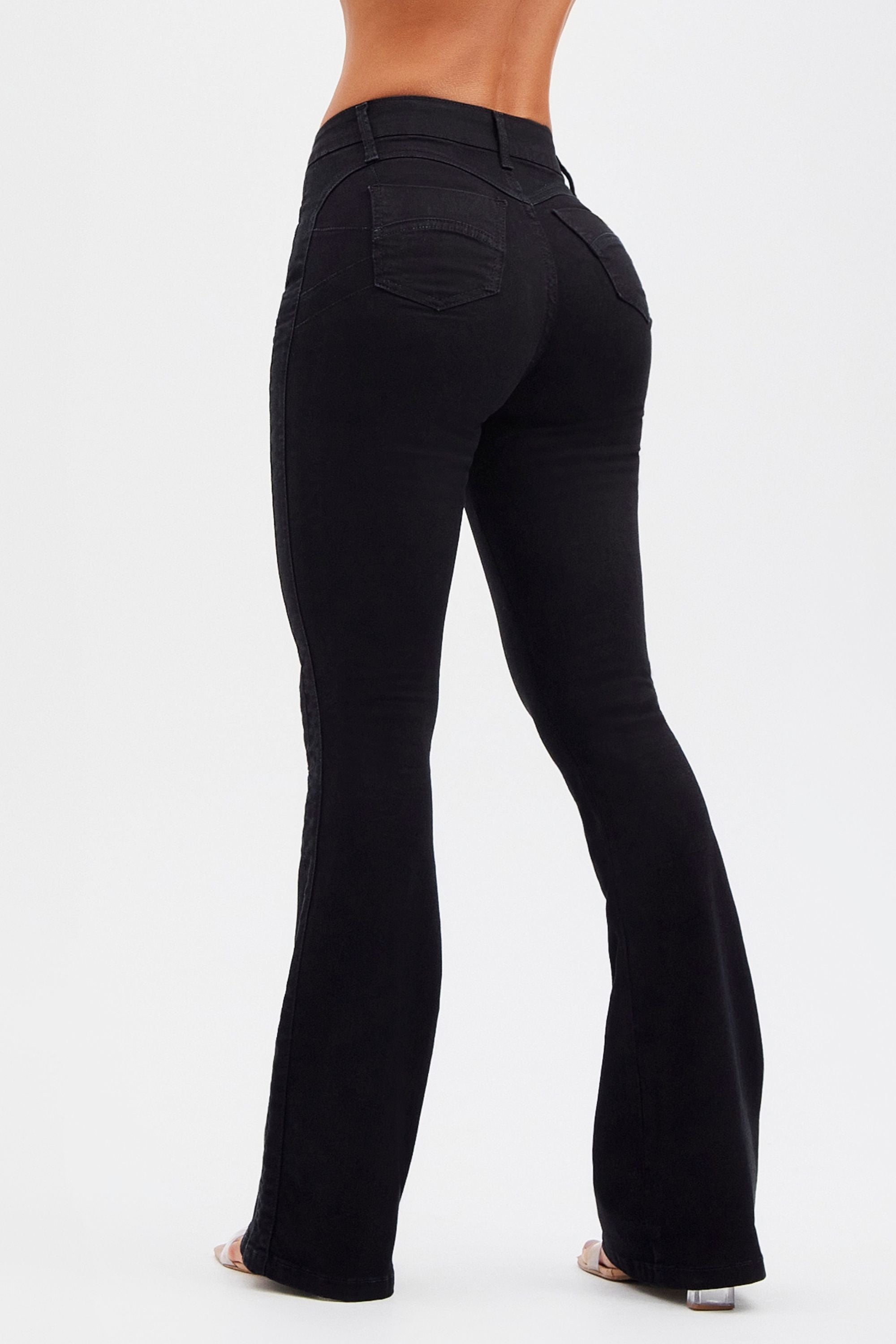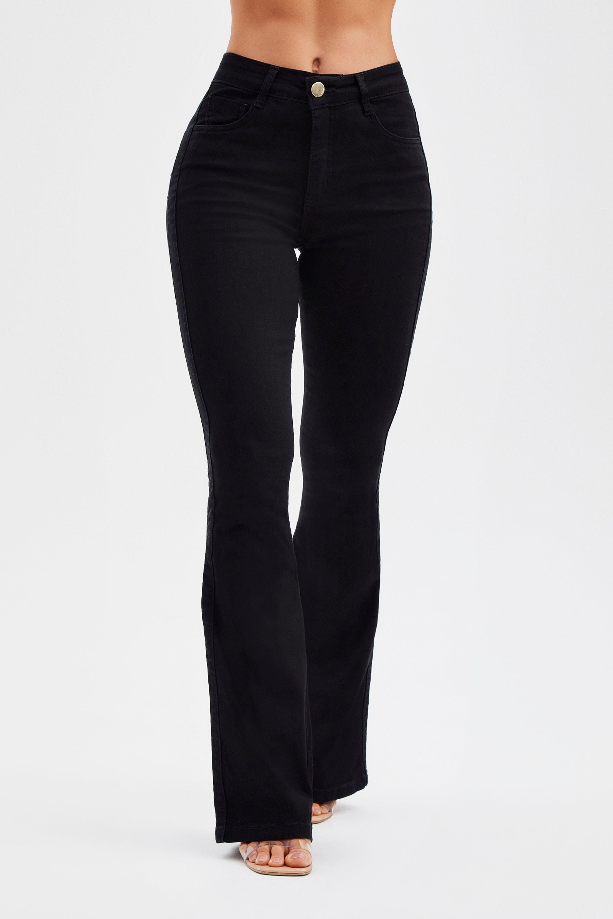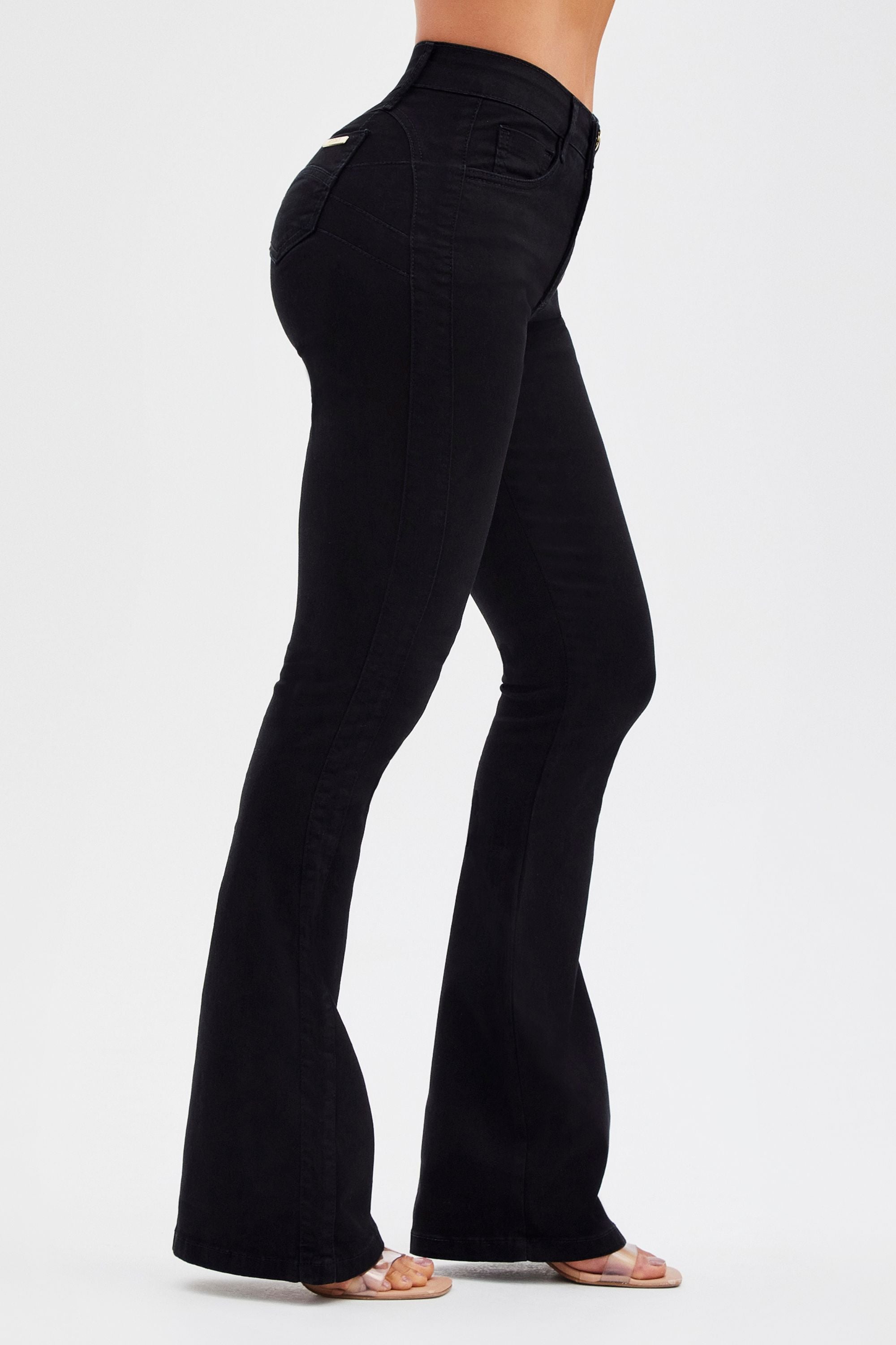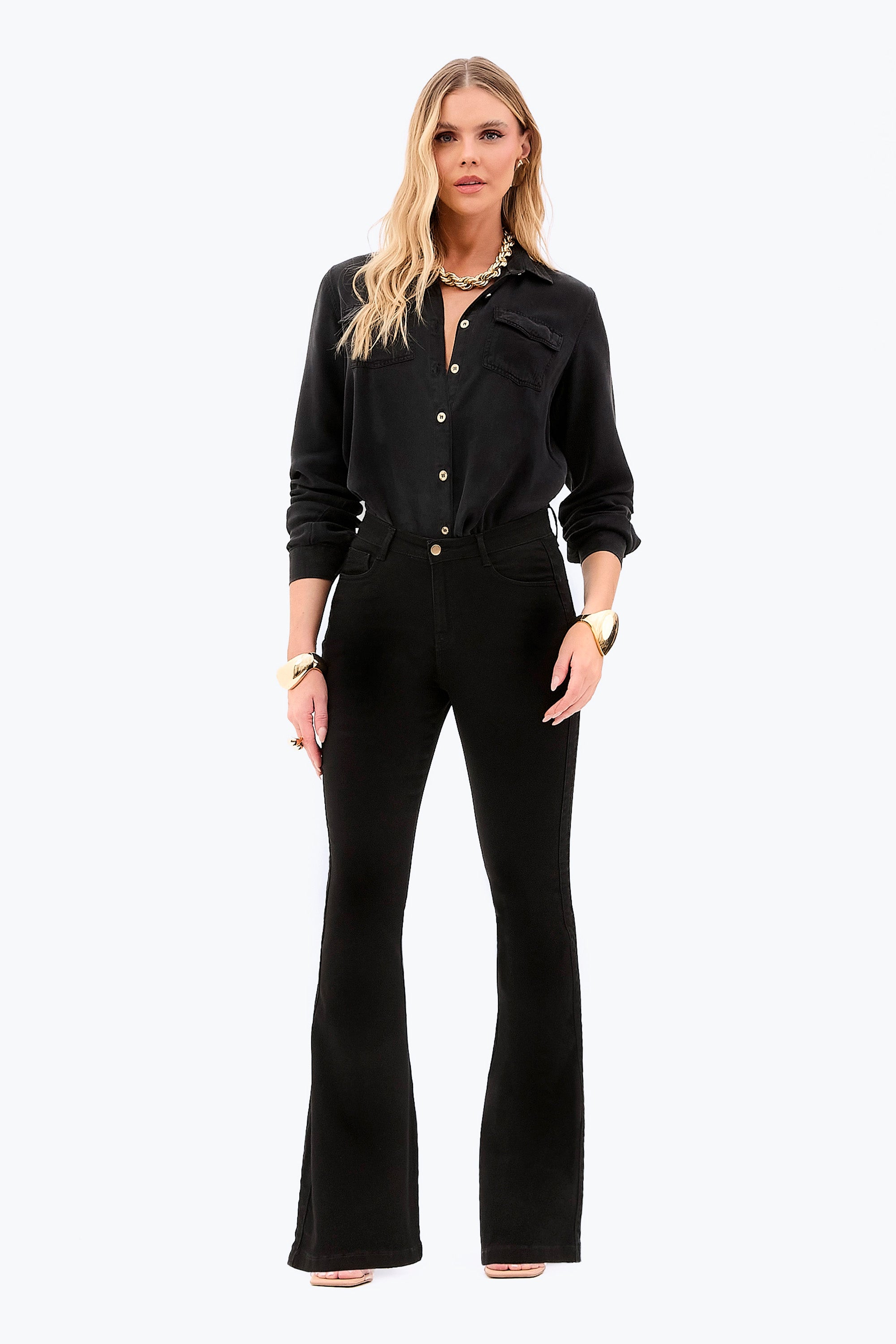 A Calça Jeans Flare Mega Bumbum Cós Médio Preto Intenso é tecnológica, super modeladora e muito elegante. Apresenta um design justo que molda a silhueta e valoriza as curvas, cós médio e modelagem flare. Com um efeito ultra modelador, ela é a peça chave para delinear e realçar ainda mais as curvas do seu corpo.