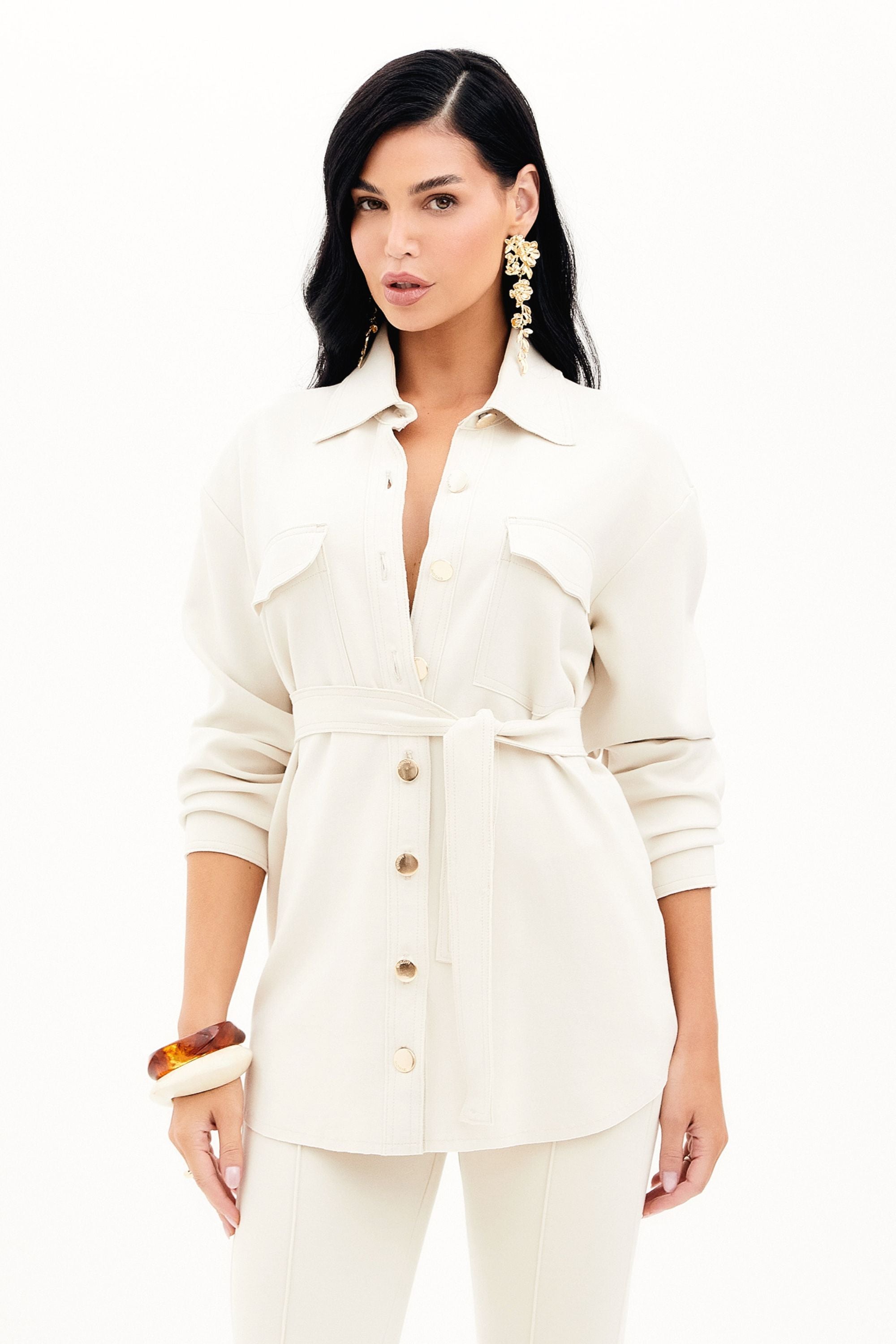 Detalhes: Possui gola e botões frontais, as mangas são longas, bolsos frontais e cinto, contém uma plaquinha de metal com o nome da marca na parte posterior da peça.