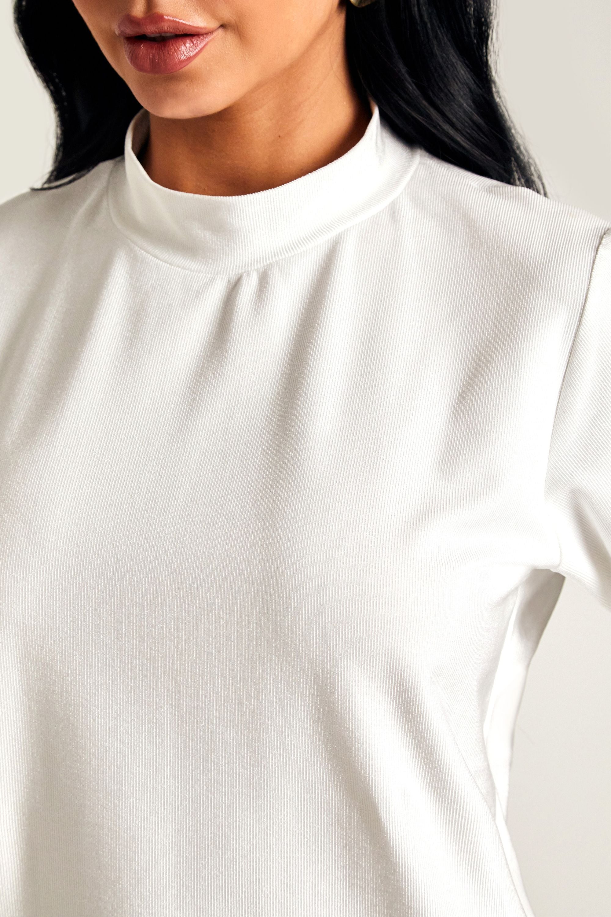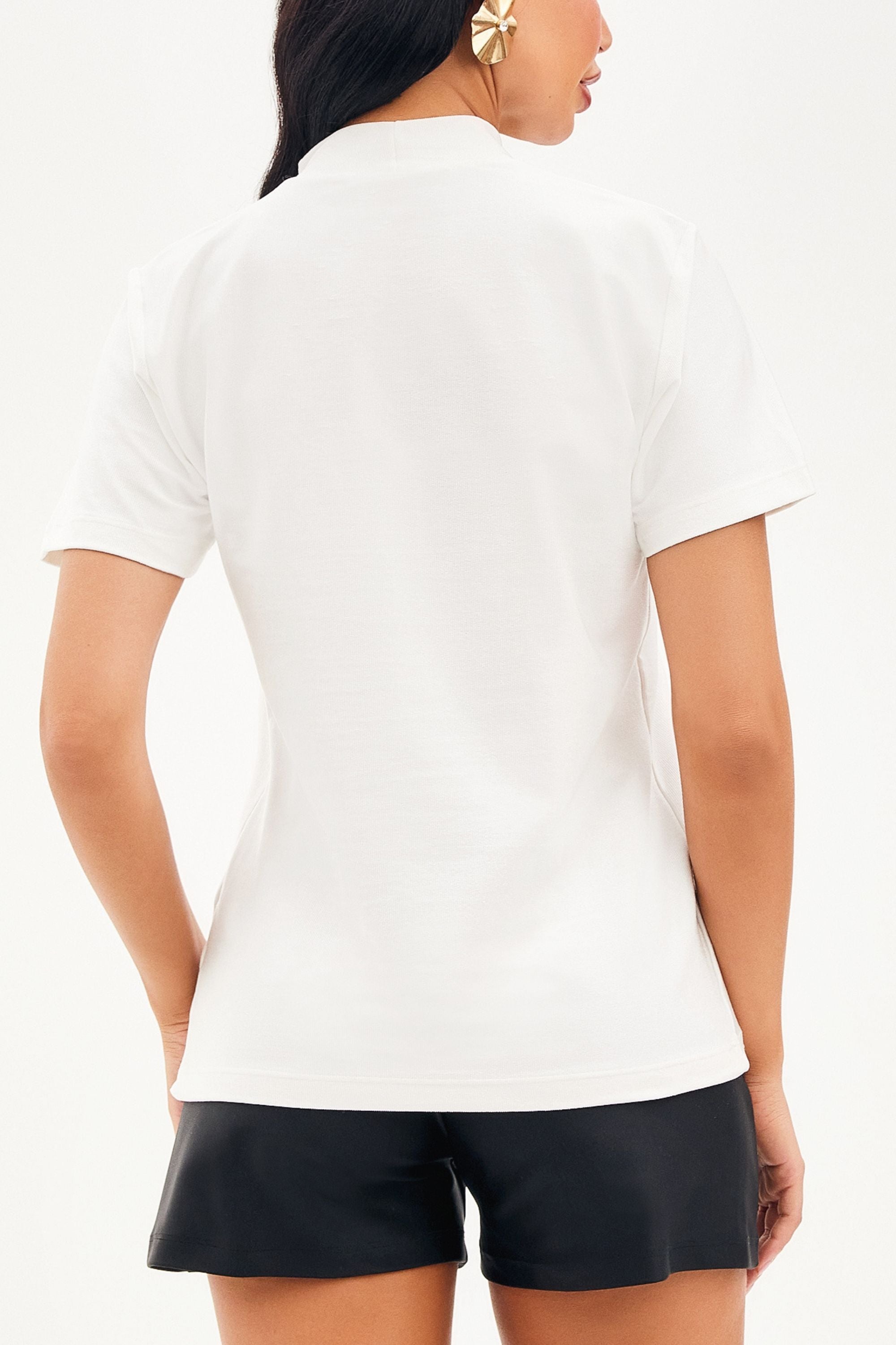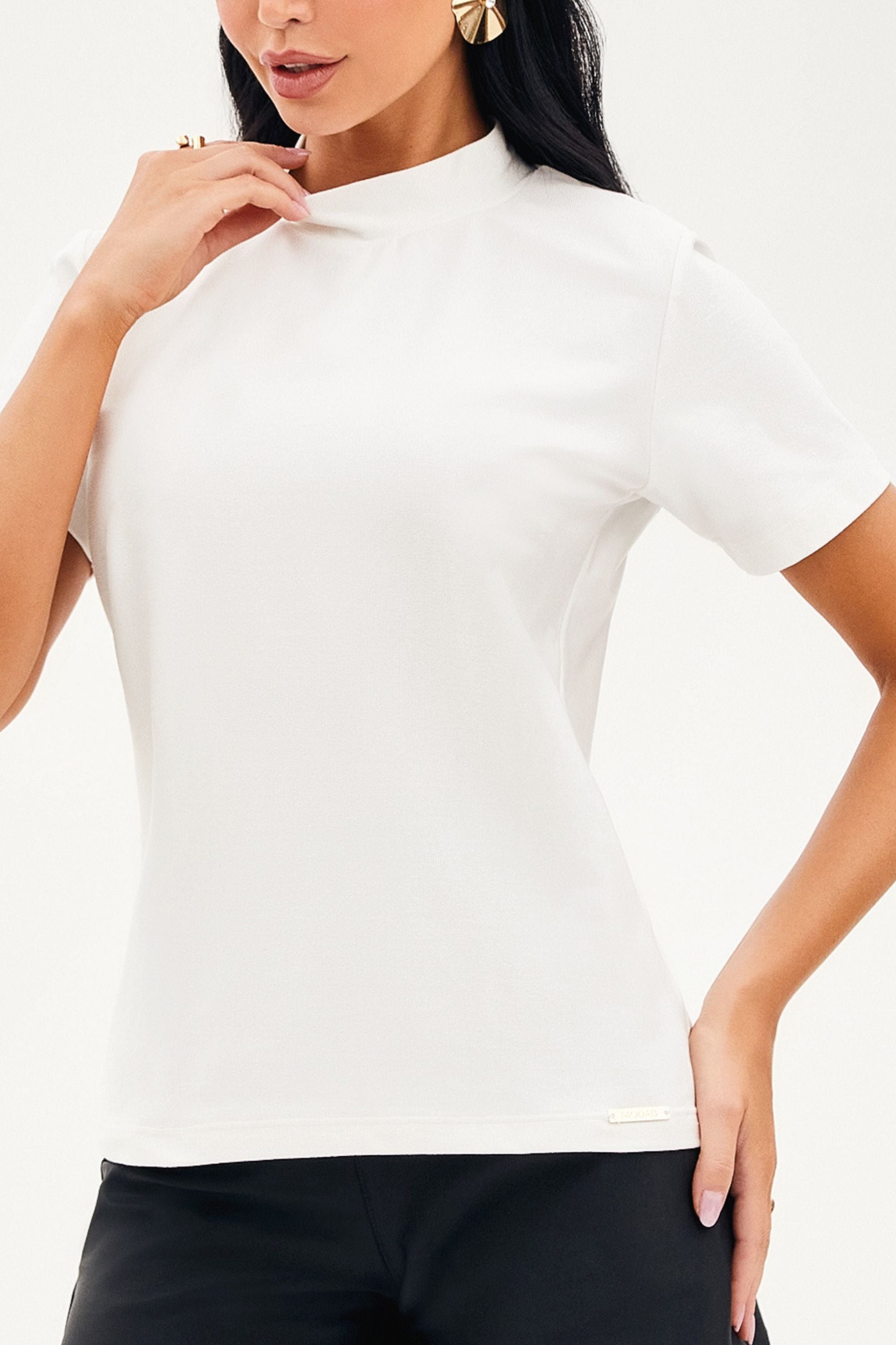 A Camiseta Premium Gola Alta com Elastano Off White é feita em poliamida com elastano e tem um toque acetinado com leve brilho que realça o visual.