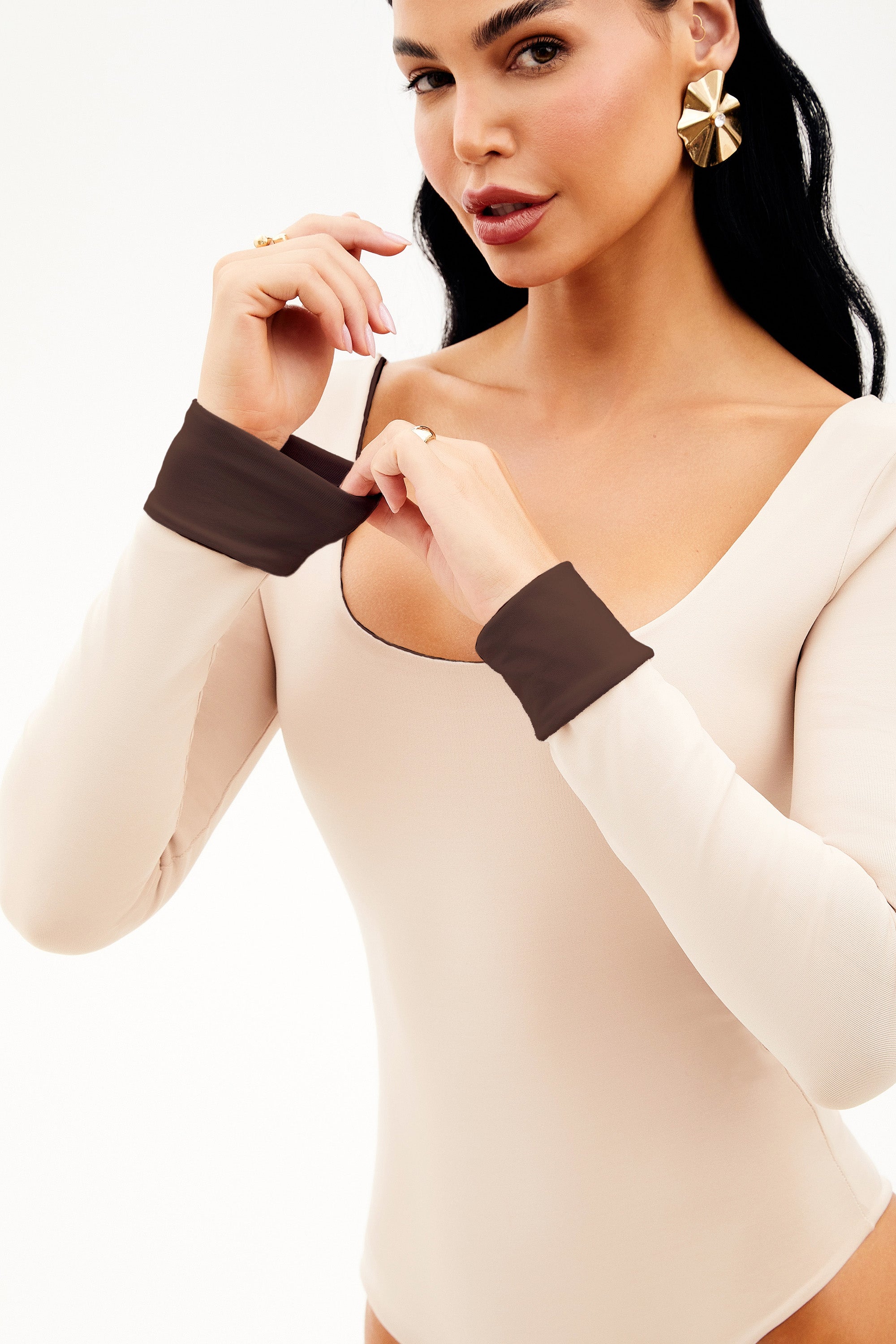 Body Manga Longa Decote Quadrado Curve Dupla Face Coffee com Nude