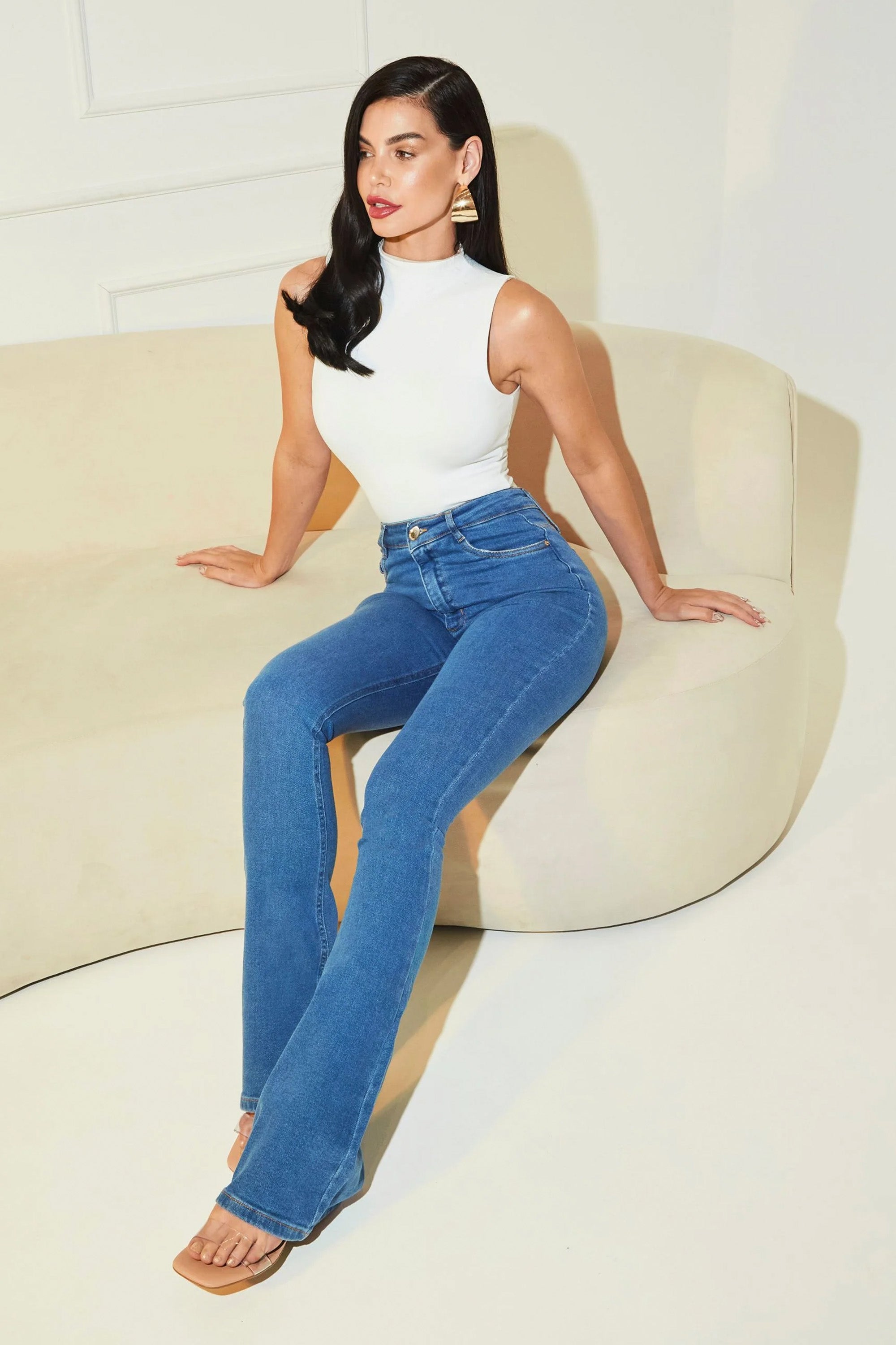 A Calça Jeans Flare Clássica Cós Super Alto é confeccionada com 99% algodão e 1% elastano, preservando a autenticidade do jeans tradicional com estrutura firme e toque natural.
