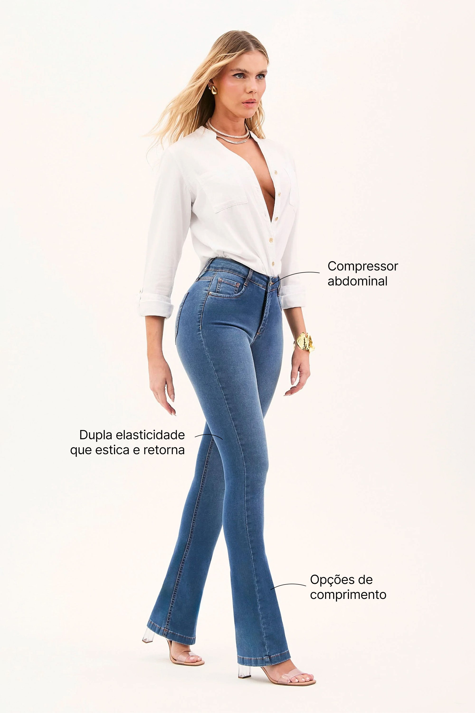 Descubra o jeans que acompanha cada movimento e variação do seu corpo sem perder a forma. A Calça Jeans Modeladora Inesquecível Boot Cut Cós Médio combina elasticidade de alta performance com recuperação de forma avançada para o ajuste perfeito o dia todo.