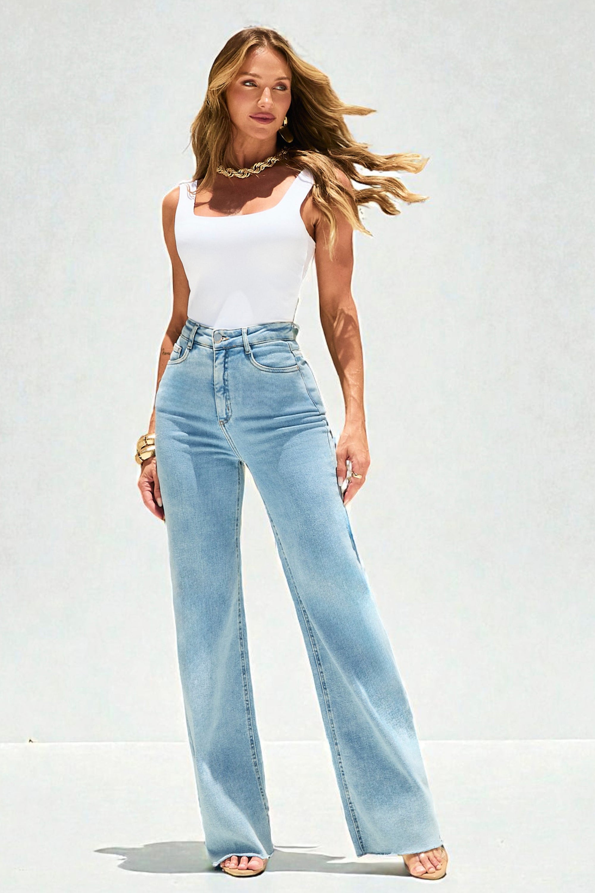 Calça Jeans Wide Leg Basic Cós Super Alto Barra Corte a Laser Clara