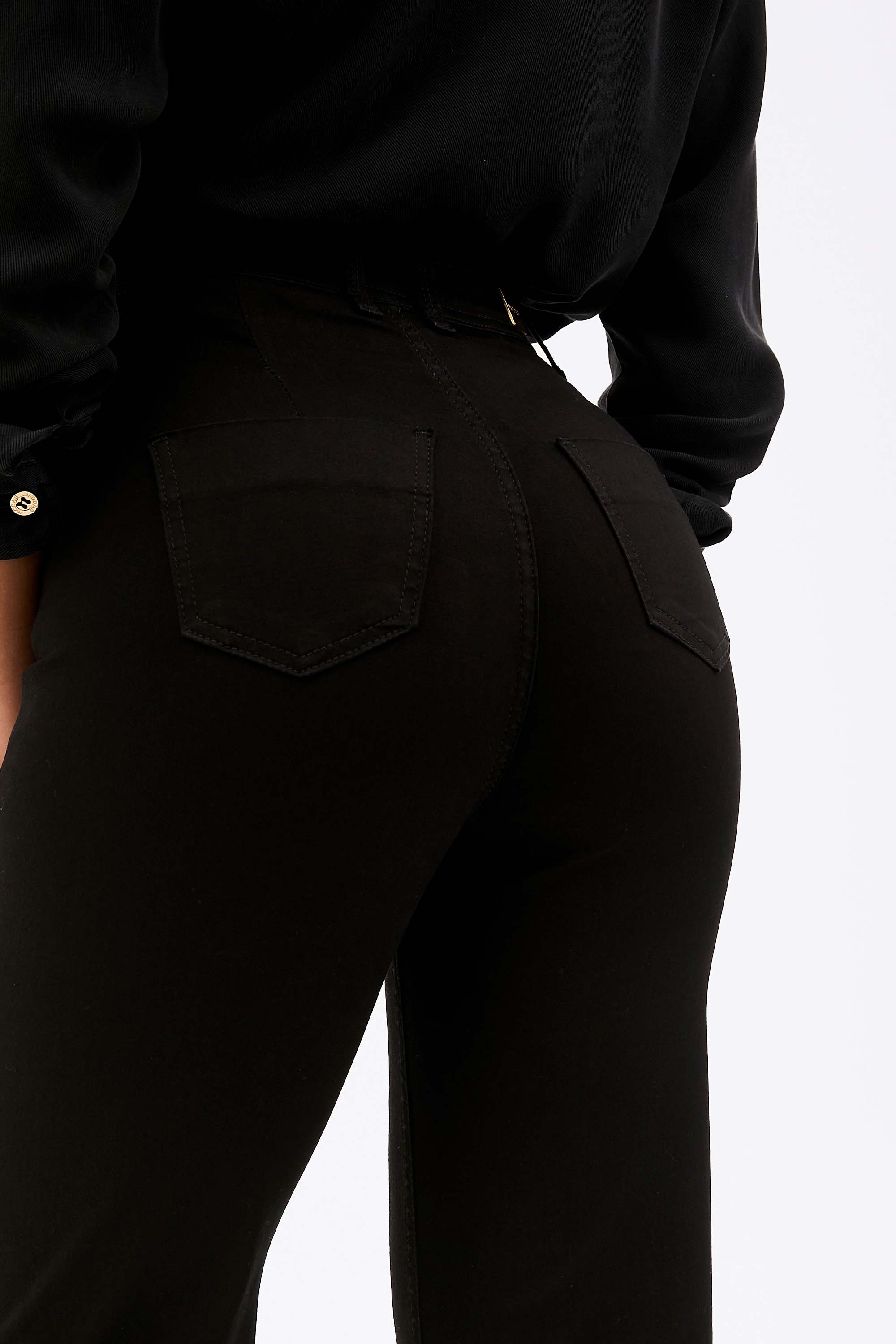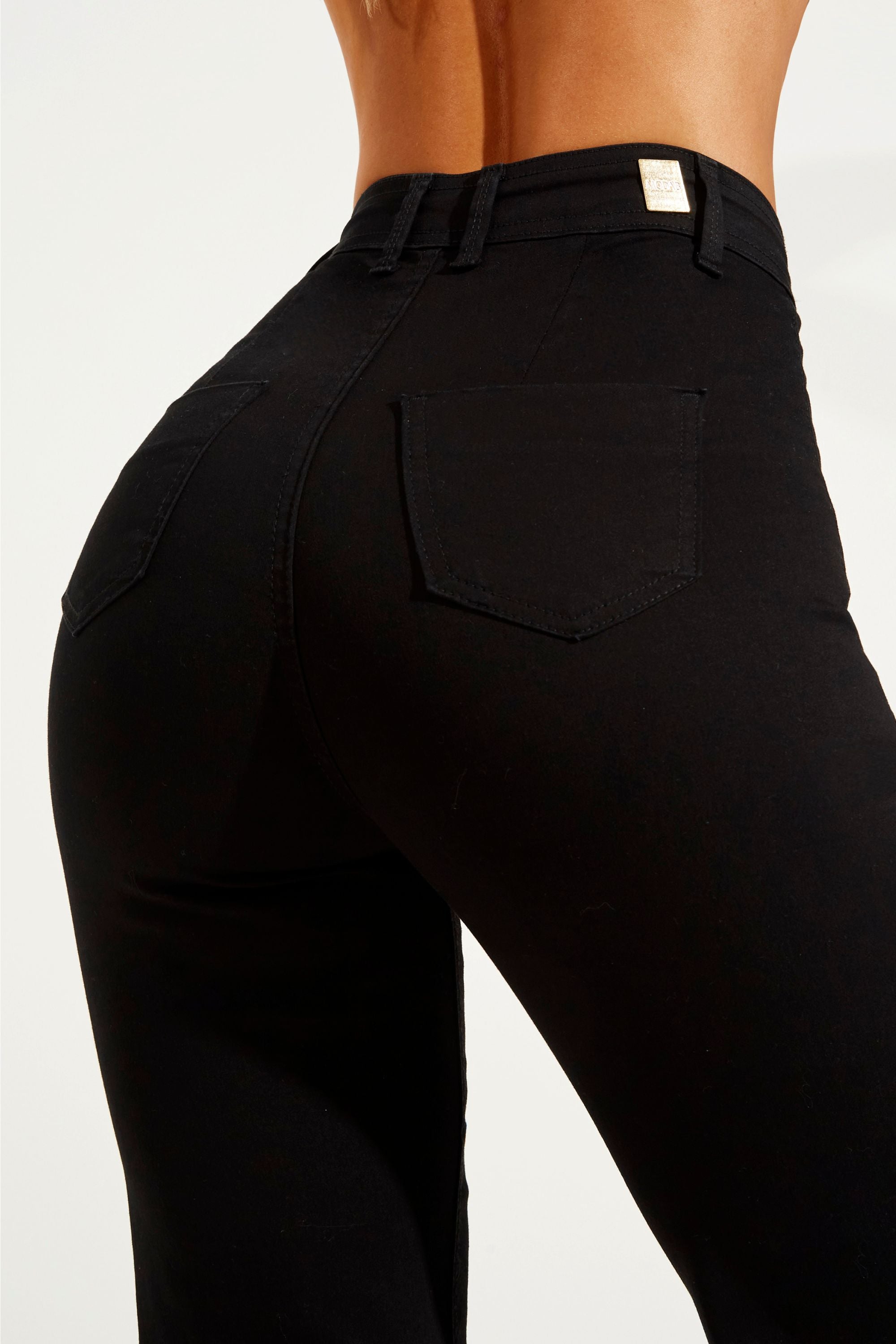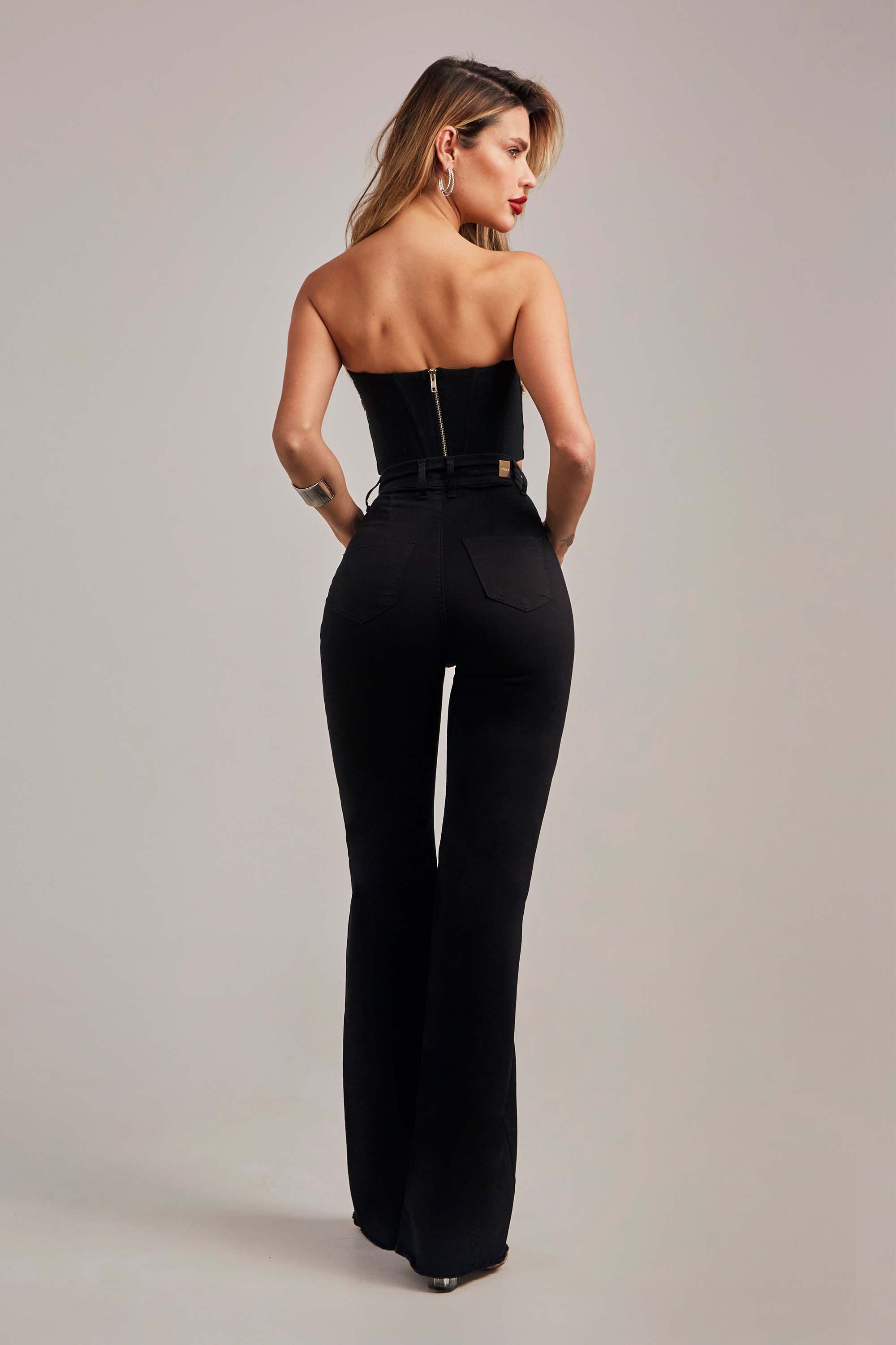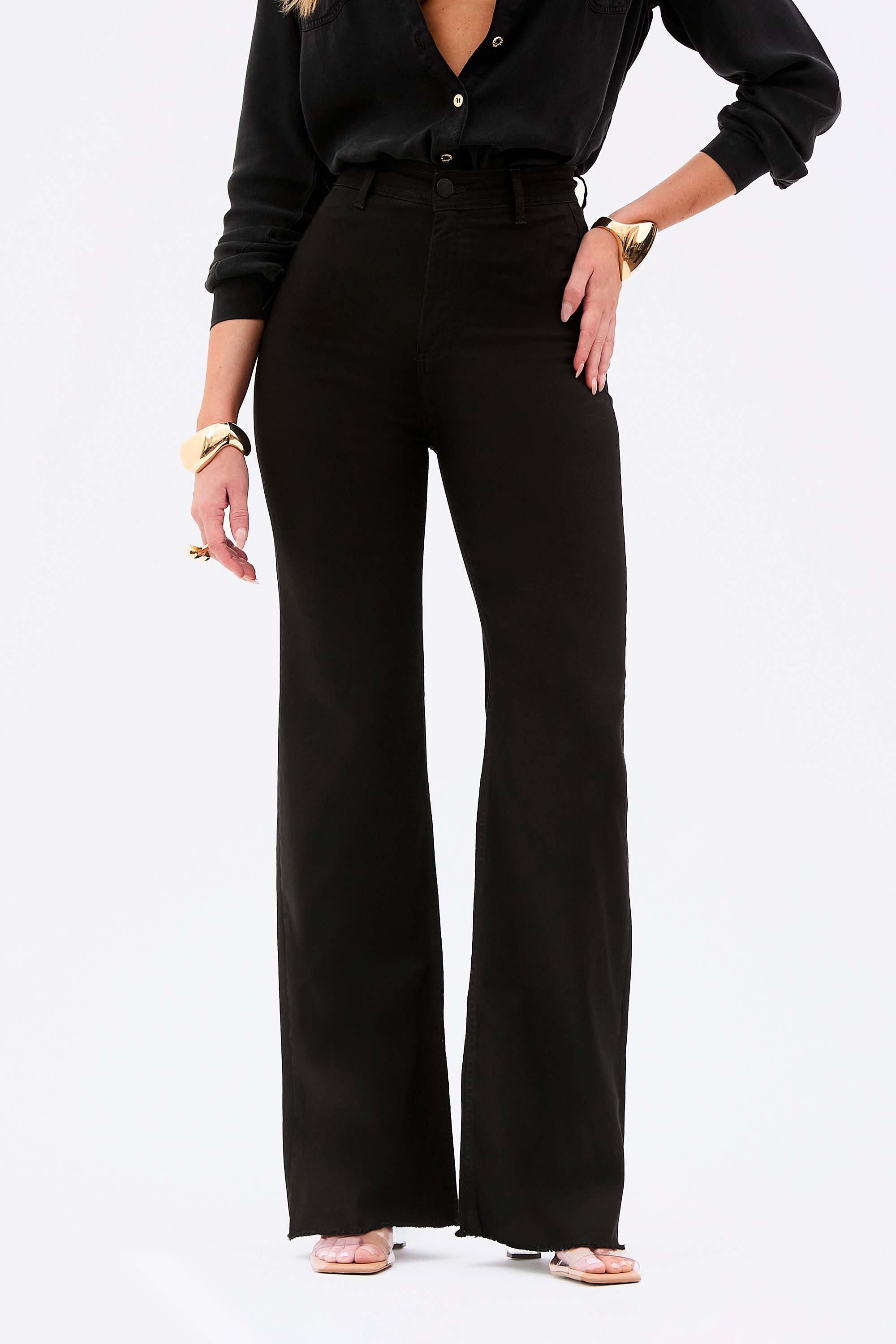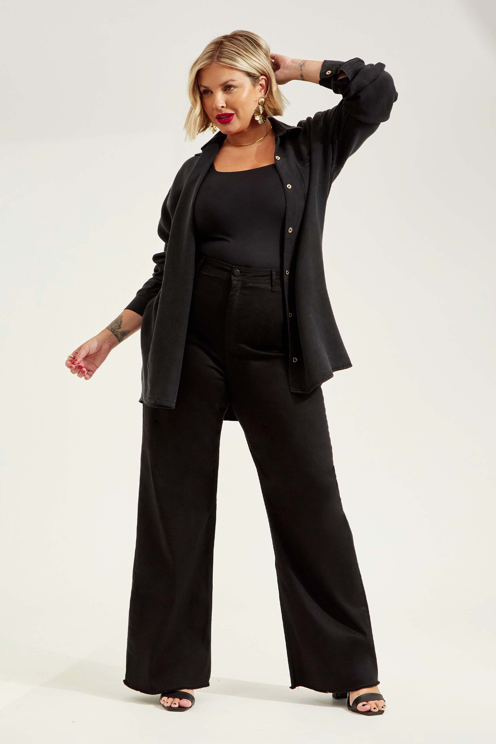 Quem nunca sonhou em ter uma calça jeans preto intenso? A nossa coleção de calças pretas possuem um tingimento duplo em seu fio, mantendo a tonalidade da cor após muitas lavagens caseiras. Aliada a isso, a nossa Calça Jeans Modeladora Wide Leg Cós Super Alto Barra Corte a Laser Preto Intenso, possui o efeito de alongar e afinar a silhueta, com um compressor interno na parte do cós que reduz medidas e afina a cintura, cinco opções de comprimento e barra com corte a laser. Não importa a sua altura ou tamanho, temos a calça sob medida para você!