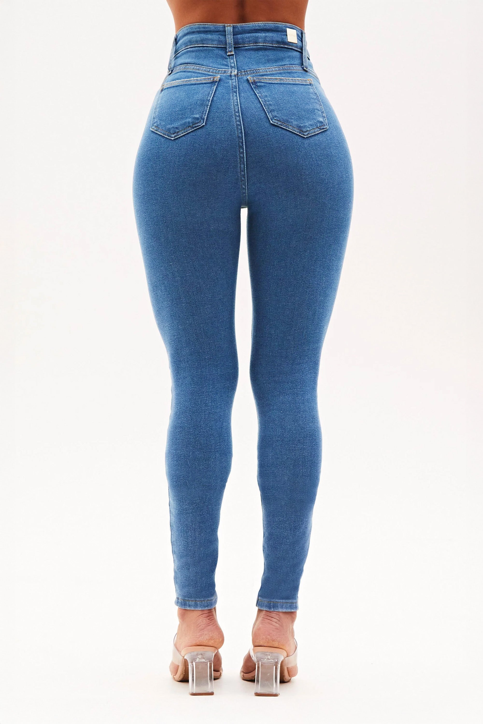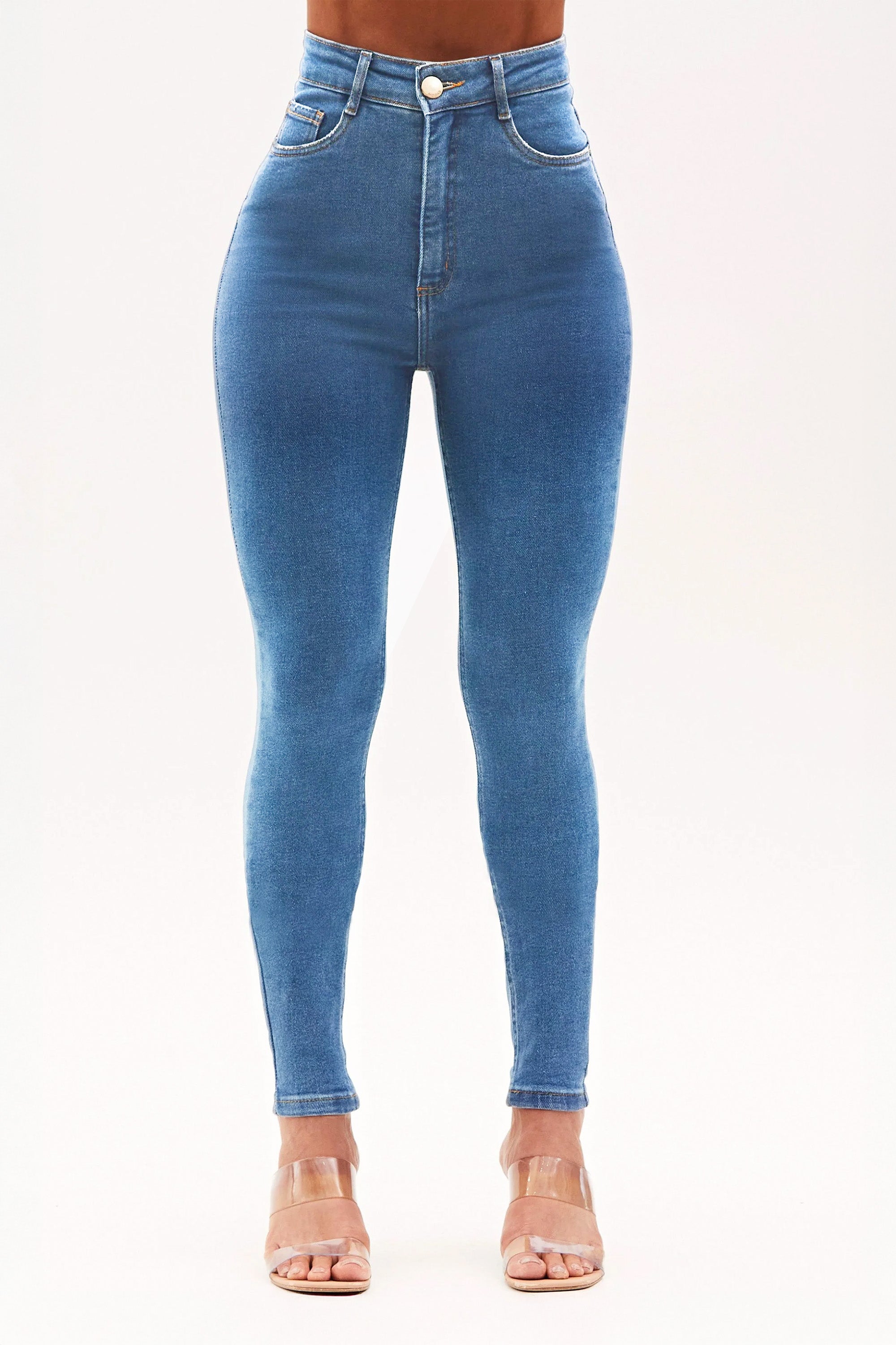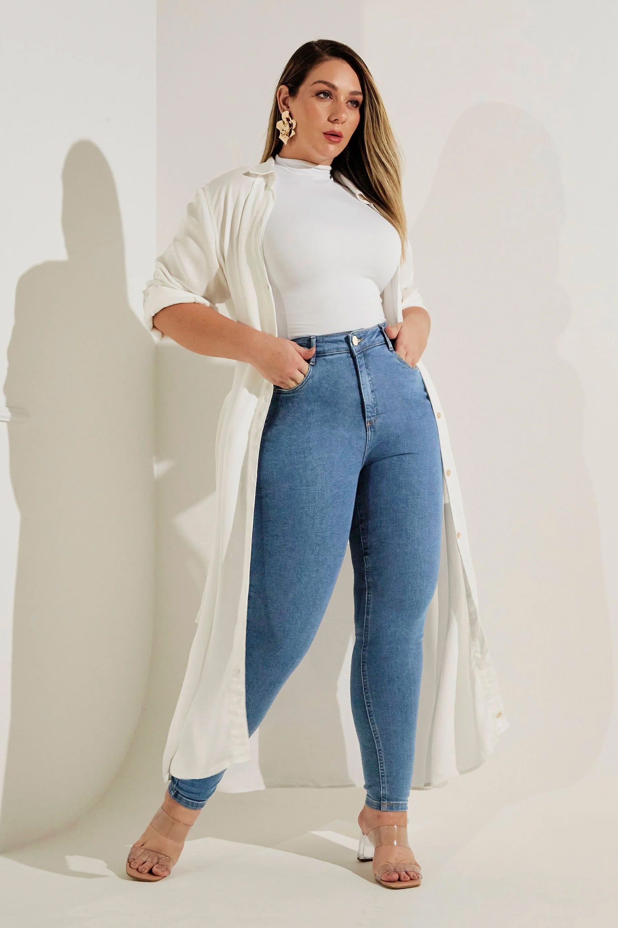 A Calça Jeans Skinny Clássica Cós Super Alto 99% Algodão é confeccionada com 99% algodão e 1% elastano, preservando a autenticidade do jeans tradicional com estrutura firme e toque natural.