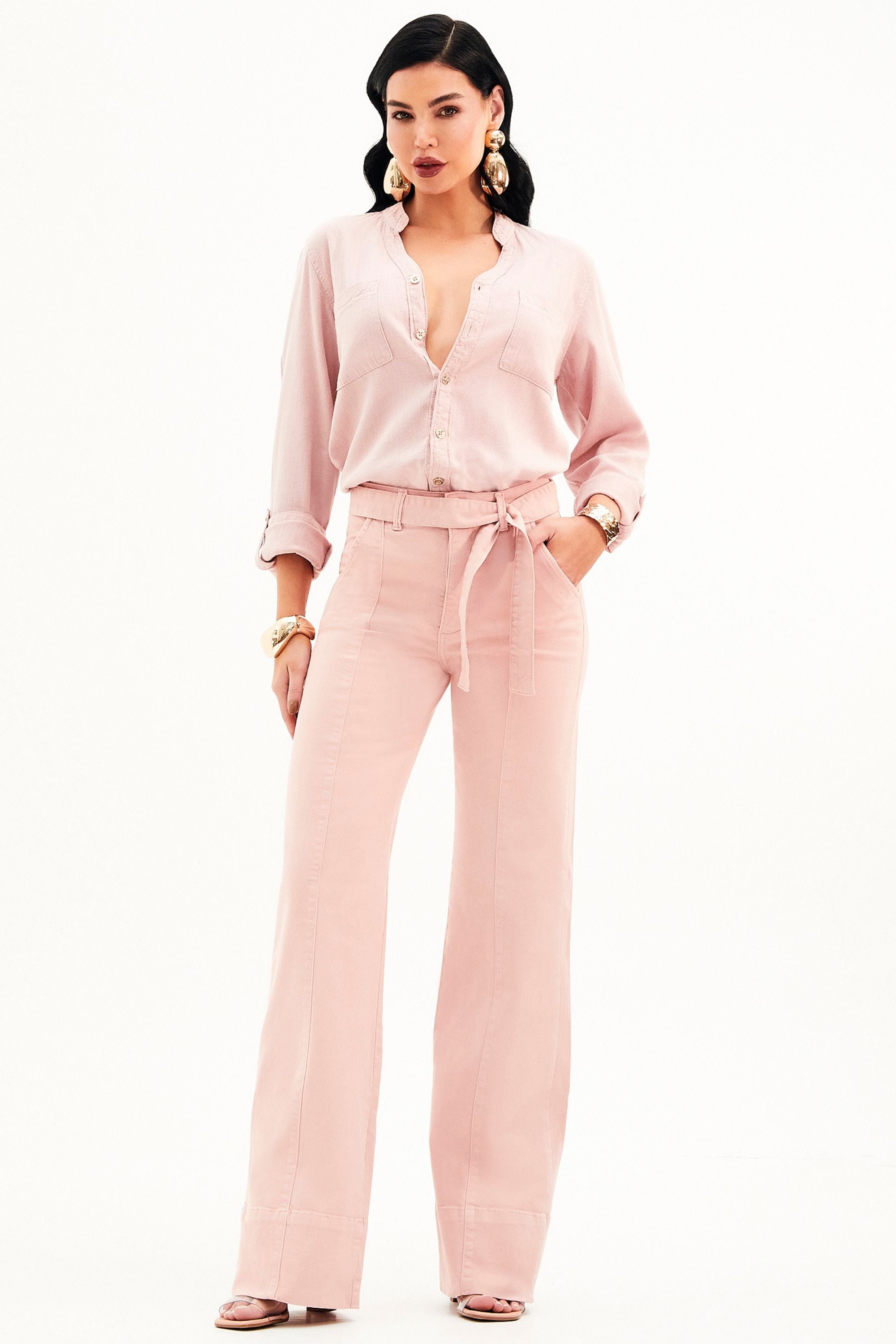 Antes conhecida como “a calça de rica”, a peça mais icônica da Modab evoluiu, e agora é Soul. Com cintura média, jeans rosa claro e shape wide leg com faixa, ela continua entregando o caimento impecável e o efeito modelador que conquistaram milhares de mulheres.