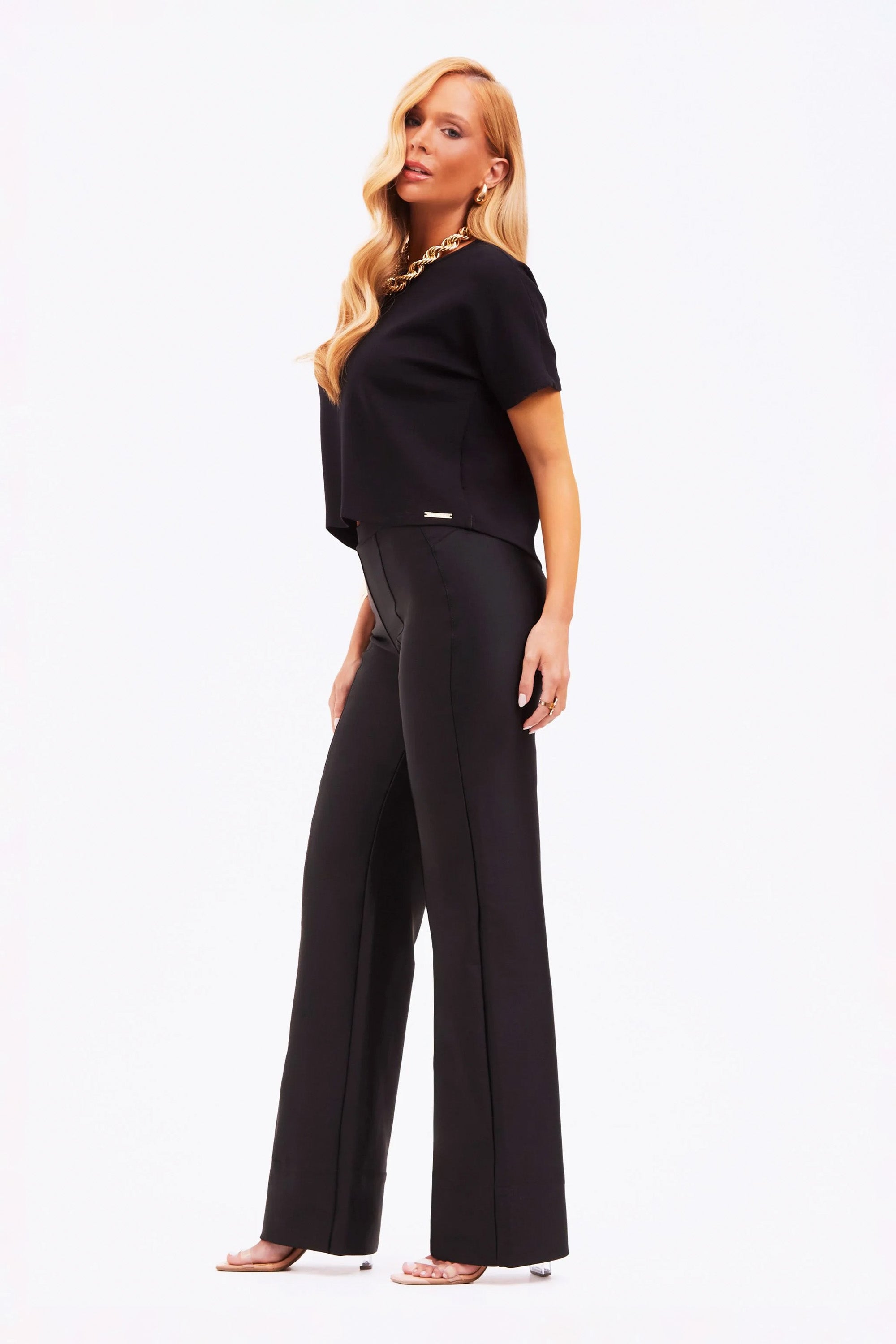 A Calça Wide Leg Modeladora Glam Cós Alto Preta é sinônimo de sofisticação e conforto. Com uma modelagem wide leg, possui caimento fluido e um tecido que não deixa marcar as imperfeições da pele. Uma peça indispensável para quem busca estilo e versatilidade com um toque de glamour!