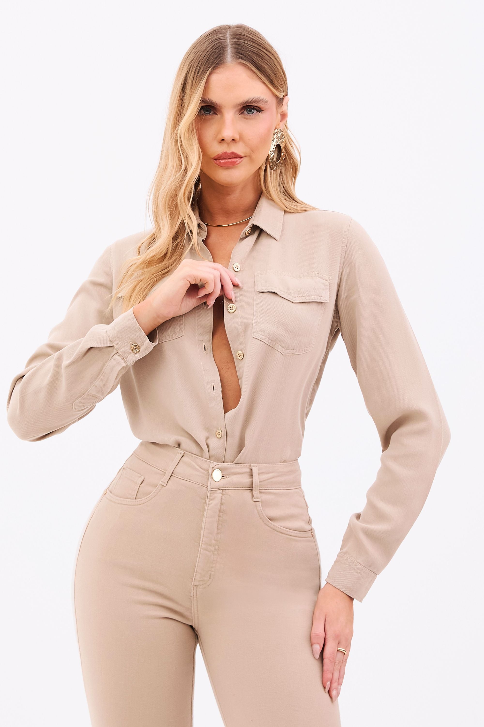 A camisa tem um ótimo tecido que além de lindo é térmico, usei em um dia quente e não senti calor. Comprei na cor nude e adorei o tom, fica lindo com vários tipos de combinações.