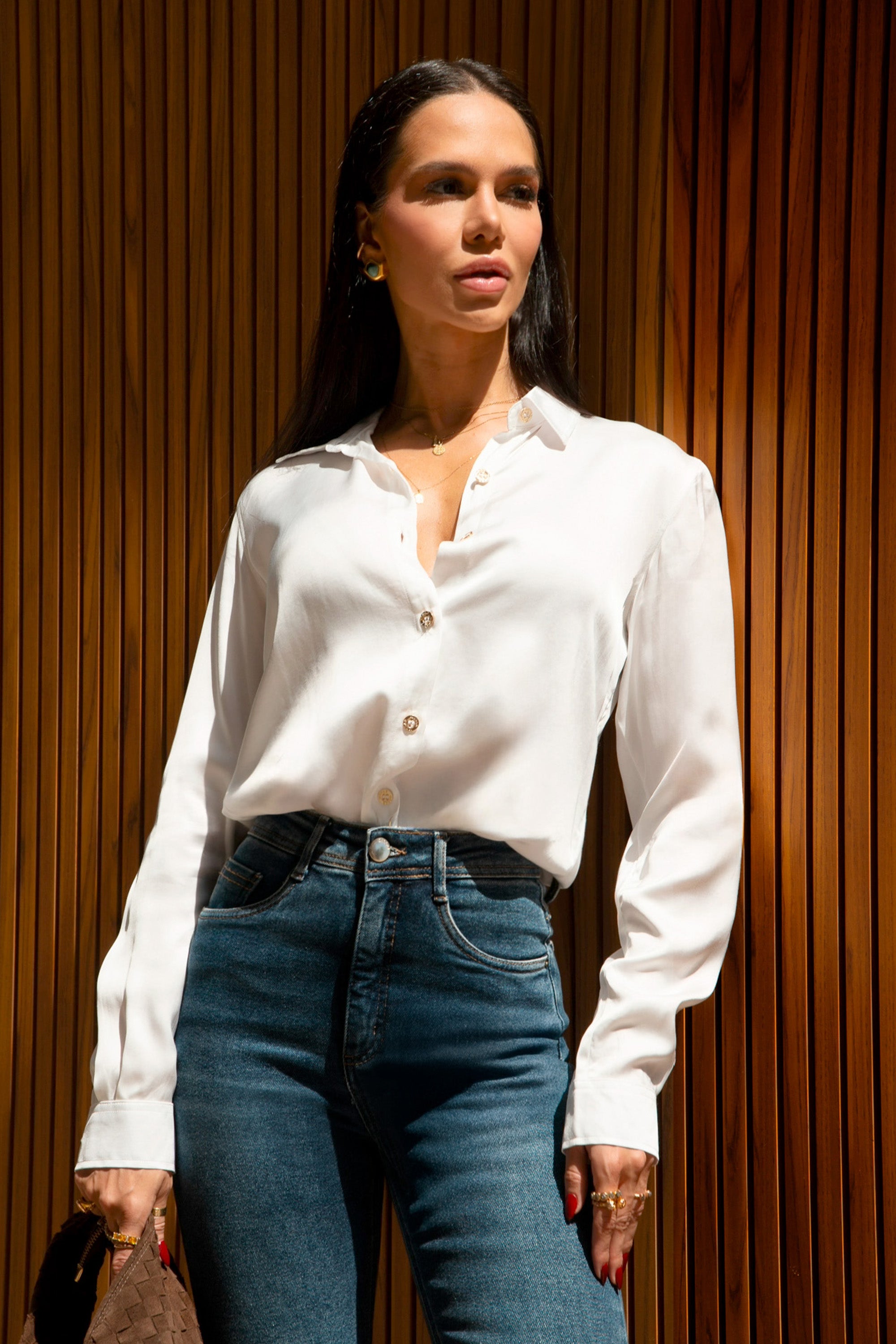 A Camisa Essence de Alfaiataria em Viscose Acetinada Off White une elegância atemporal e modernidade. Possui efeito acetinado inspirado na seda, com brilho sofisticado e exclusivo. Seu toque macio e suave proporciona conforto absoluto, enquanto o caimento clássico sob medida valoriza a silhueta!