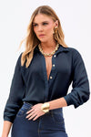Detalhes: Possui gola e botões ocultos, as mangas são longas com punho e contém uma plaquinha de metal dourado com o nome da marca na parte posterior da peça.