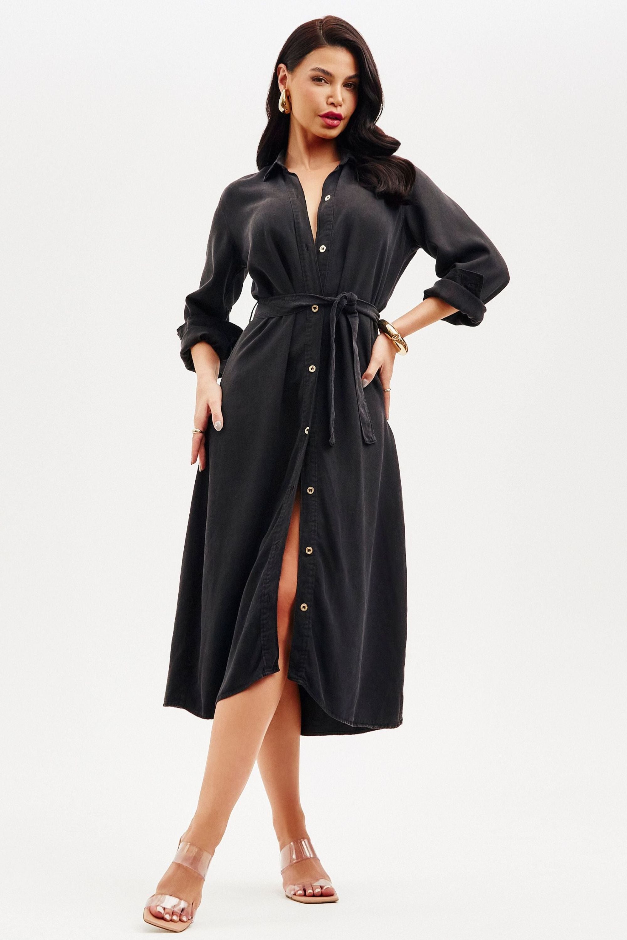 • A modelagem é sofisticada, elegante e com silhueta alongada e cinto;