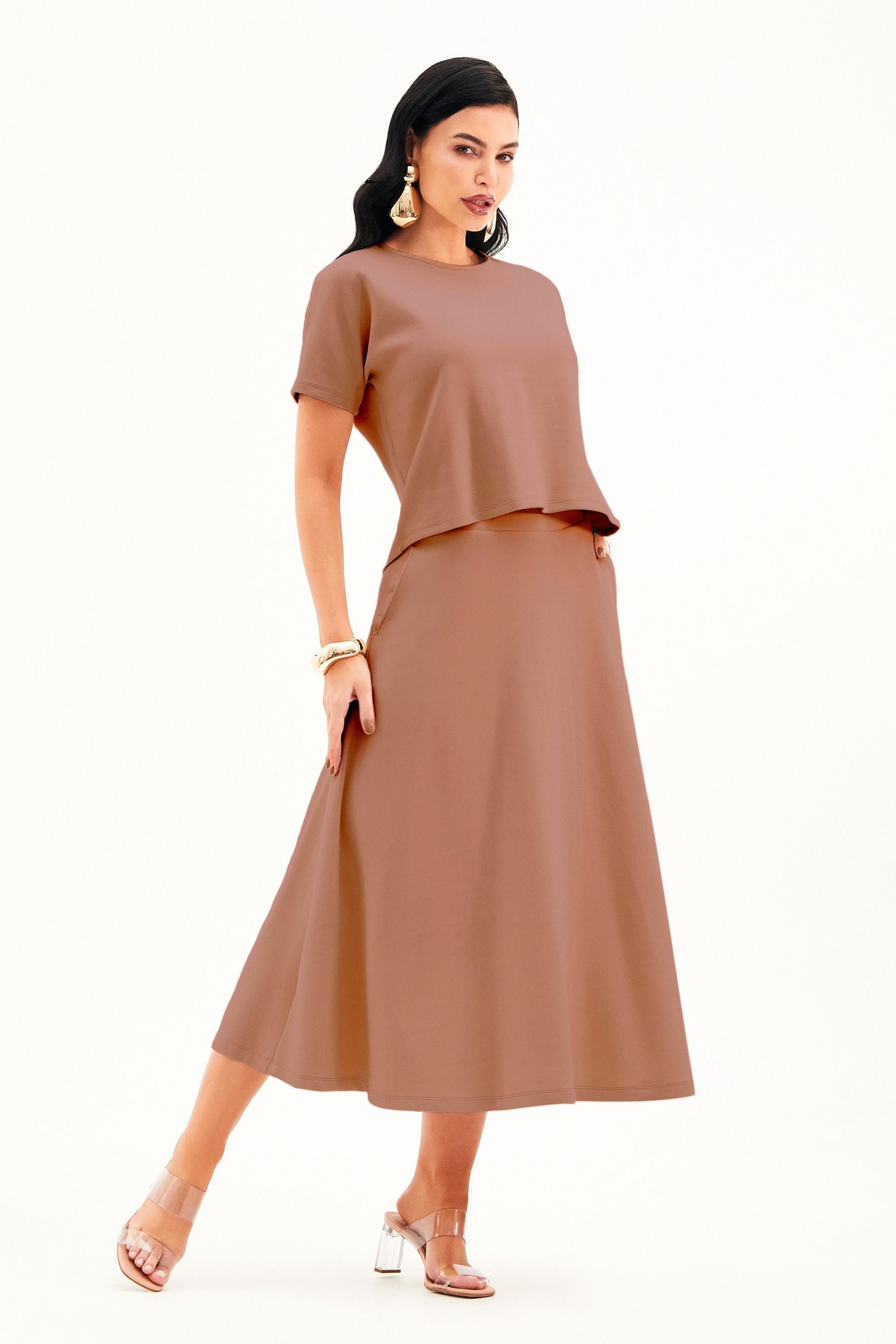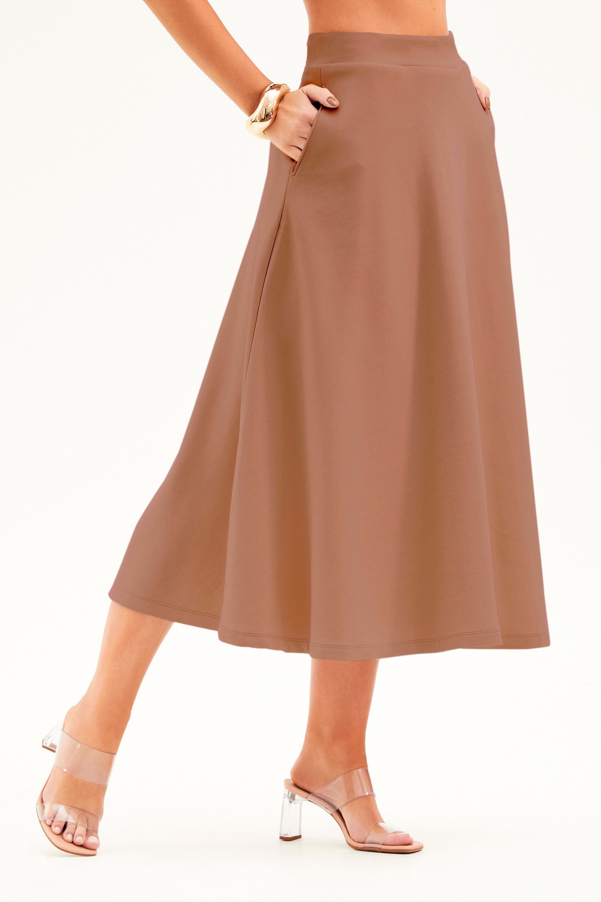 A Saia Midi Evasê Comfort Office Mocha Mousse une conforto e versatilidade em uma peça que acompanha você em todos os momentos! Com comprimento midi, design minimalista e um toque incrivelmente macio, ela se destaca pela tecnologia que se ajusta ao seu corpo e aos seus movimentos diários. Simplesmente perfeita!